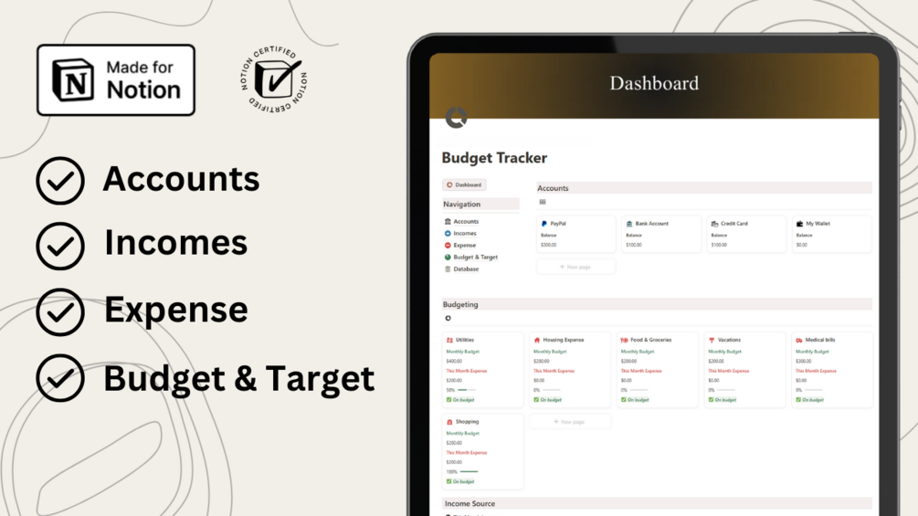 The Budget Tracker template in Notion is crafted to simplify financial management and bring clarity to your budgeting, spending, and saving goals.