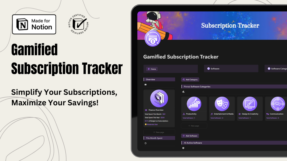 The Gamified Subscription Tracker in Notion is designed to simplify your finances while making expense tracking fun and interactive!
